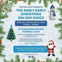 Early Christmas 80s Day Disco Party With DJ Phat Pat spinning 80s-00s hits at Blackburn Rovers Football Club, 3-8pm, Sat 29 Nov, Strictly Over 30s...TNC Presents Jordan Peak