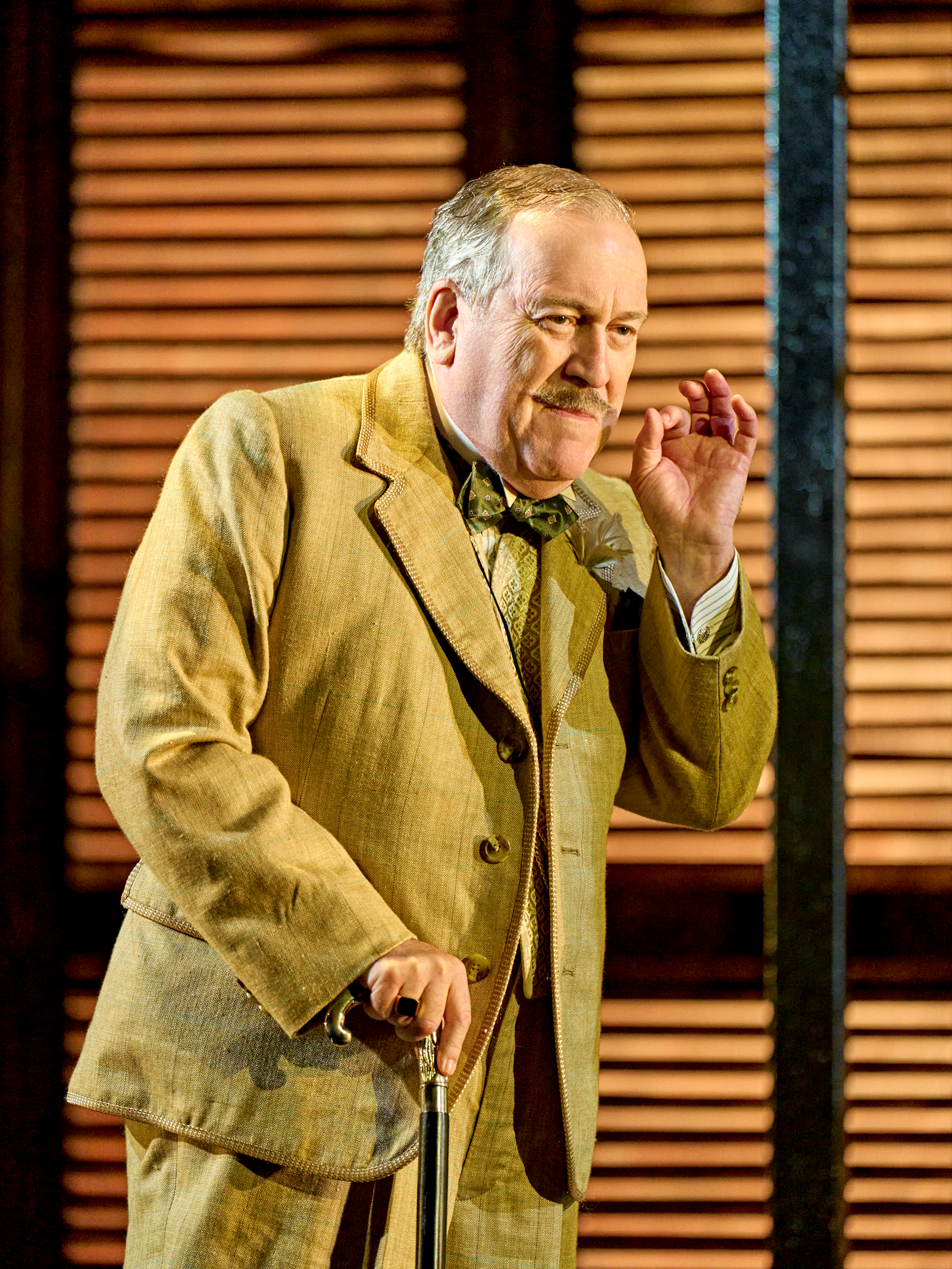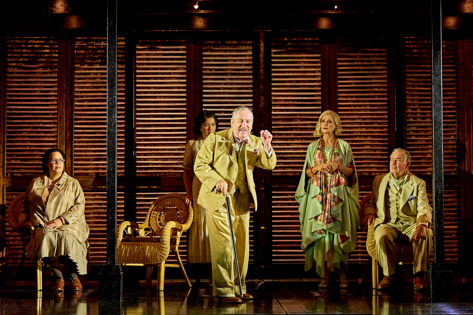 Adapted for stage by Ken Ludwig, Death On The Nile is classy, exudes style, and gifts us a fabulous perspective on this wonderful classic. With astute references to literature throughout, such as Shakespeare, Wind In The Willows, and even references to previous Christie works such as Murder On The Orient Express, there is a gentle playfulness at work that allows the audience to feel a part of tongue in cheek humour. And that is one of the most generous offerings of this production, we the audience feel considered and included throughout. There is an effortless flowing rhythm to dialogue, with jokes a plenty, that are carefully laid out like enticing breadcrumbs for us to follow, so that when the shocks come, they hit hard. Poirot is such a well-known detective that touching anything he belongs to could be a blessing or a curse, but under the expert guidance of Ken Ludwig, we most definitely feel we are reuniting with an old friend who is just as pleased to see us as we are him. This adaptation is also wonderfully self-aware, embracing the familiar formula of any Poirot story, and leaning into it, so that when the expected gathering of the suspects is ready to commence, where Poirot will dissect everyone’s alibi to highlight that nobody could have done it, yet indeed someone did, it is even expected from the characters themselves and they laugh about it! In turn, this opens an opportunity to spotlight with more intensity, just how much Poirot lives for these moments and though he loathes the crimes, he loves solving them with every ounce of his being.