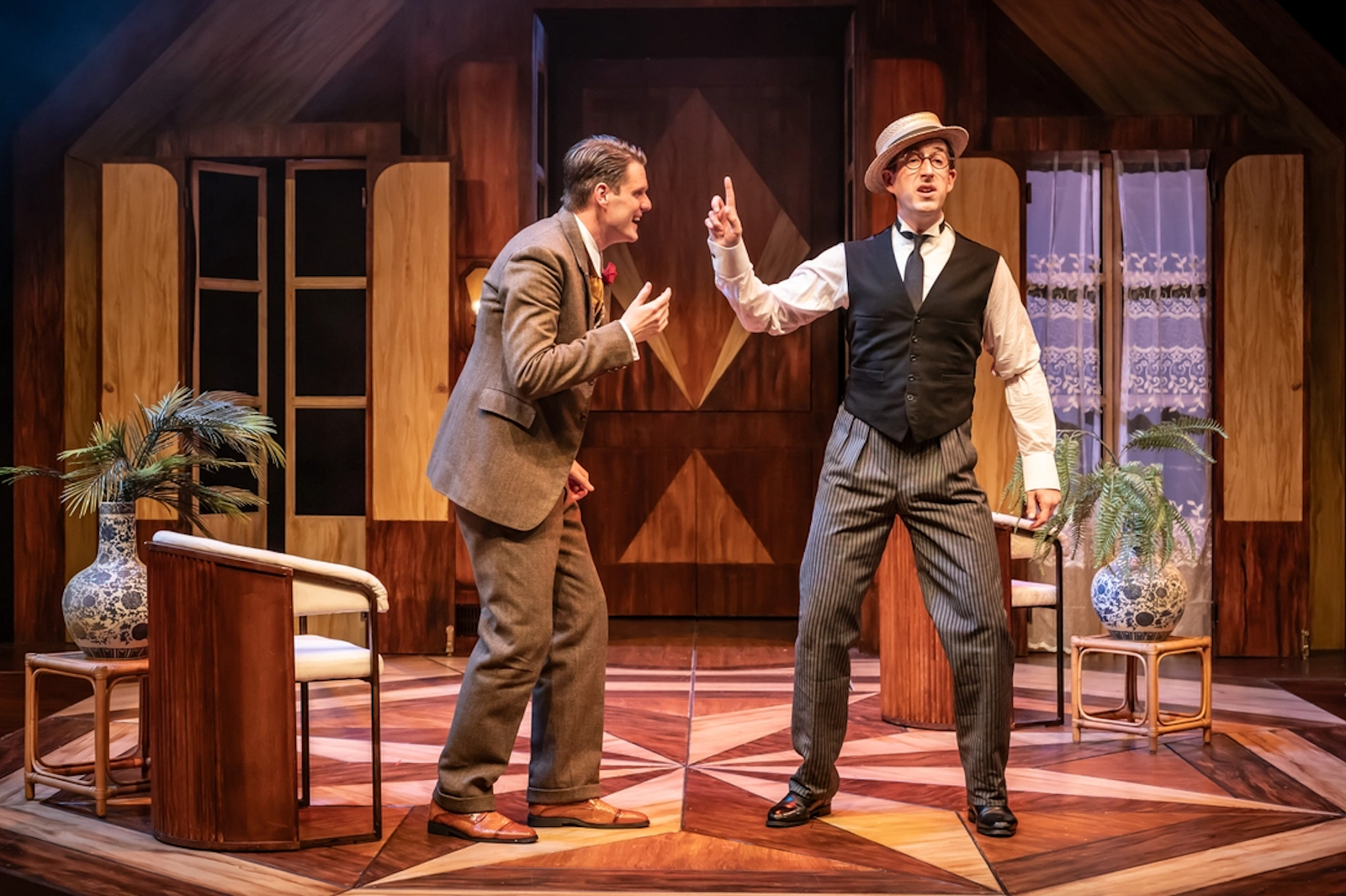The set itself presents many of the punch lines, and whilst you may walk into a stunningly classy art deco design, do not be fooled as it holds more secrets than Jeeves’ secret Valet members only club! Designed by Olivia Du Monceau, its transformations from Berties pad, to an antique shop or to a variety of rooms in Totleigh towers, and they are all hidden in plain sight. Its brilliance lies is in how we see the magic of set design taking place right in front of us, and we see it through the wonder of Bertie’s enchanted eyes. The audience gladly suspend their disbelief, and a most glorious moment was the transformation of some chairs, a few sticks and dinner plates, into a car! The affection of Jeeves and Seppings for Bertie in this scene is wonderful, seeing the lengths they go to in order to indulge his play. We are even treated to a foley soundstage, complete with a railway crossing. It is theatre skills at their best. Director Marieke Audsley has to be applauded for the playfulness, resourcefulness, and inventive imagination when making such known characters feel fresh and new.