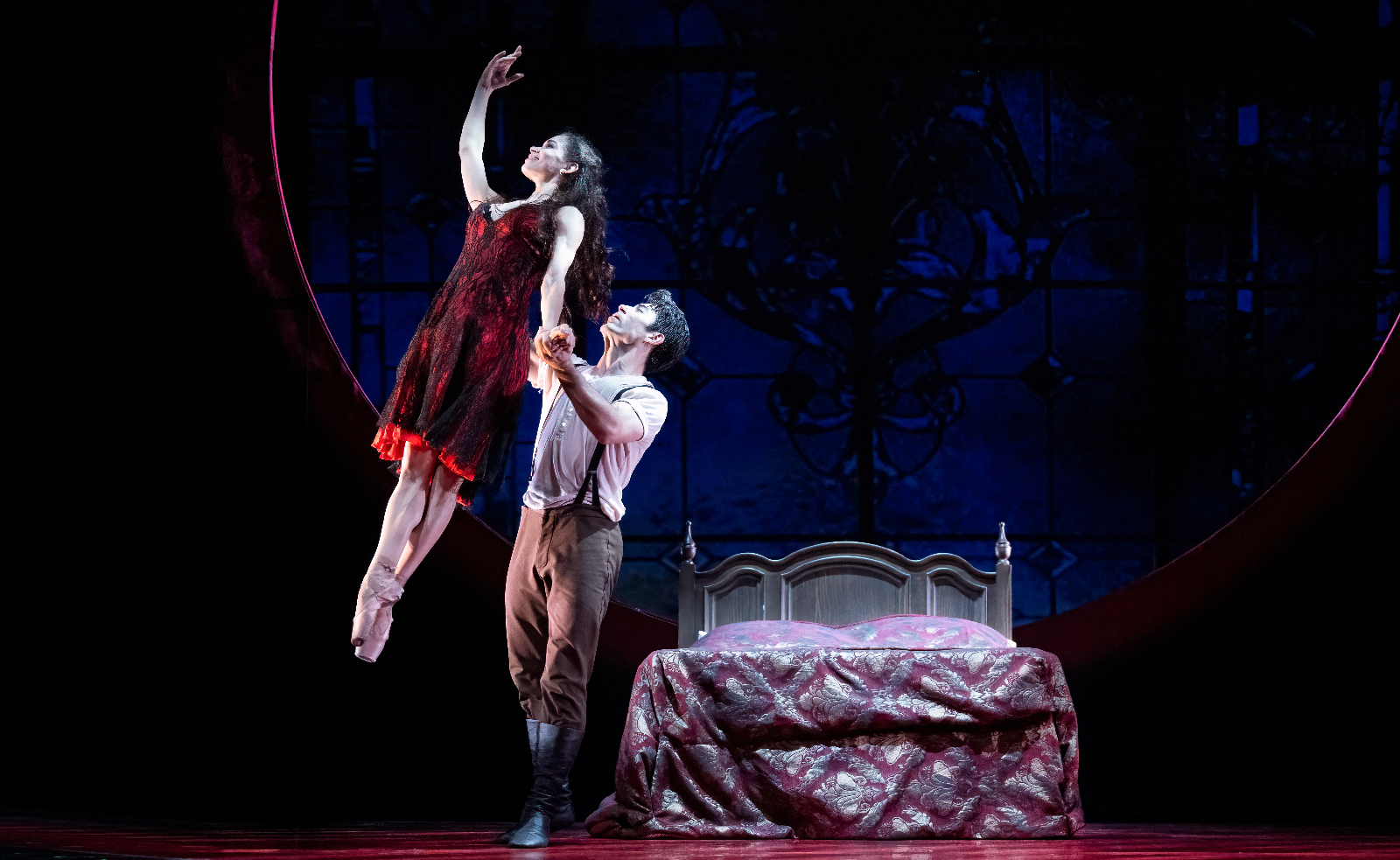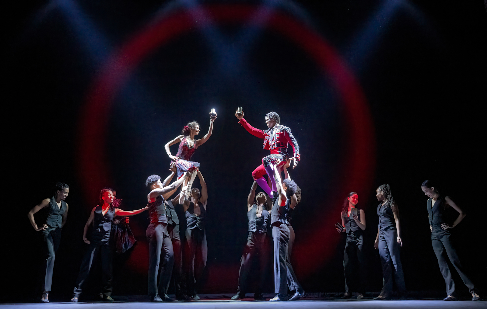 Choreographed by Carlos Acosta, the show was first born in 2016 as a one act ballet and has since gone through various transformations, including the involvement of Tim Hatley (set and costumes), Peter Mumford (lighting), Nina Dunn (video designer), Rodion Shchedrin (music arrangement), and Martin Yates, Yhovani Duarte and Denis Paralta (additional music) for this current full length ballet touring production. The tempestuous colour scheme of red and black floods your mind instantly, evoking passion, heat, fire, desire, and it amplifies the dancers storytelling beautifully. A large red circle dominates the stage, a source of temptation that seems to pull the story and characters towards it throughout. Low slung lighting in the bars provide atmosphere, and imposing metal bars are used for a multitude of purposes which allow the space to be continually reimagined and revamped. Projected imagery appears throughout in the centre of the red edged circle that fills the back of the staging, taking us through different locations with ease. Staging is minimal, allowing the dancers to own every inch of it, giving them the freedom of space in which to perform. The second act opens with a red and black freeze frame of dancers, effortlessly chic and cool in an almost Fosse resemblance, dressed in waistcoats, slick and sharp with clean lines. This leads into one of the revamped extensions of the production with the inclusion of additional corps de ballet scenes, and a new solo for Carmen. The tavern scenes were amongst the most rousing, and the dancers themselves appeared to be fully engaged and loving the expression they were afforded.