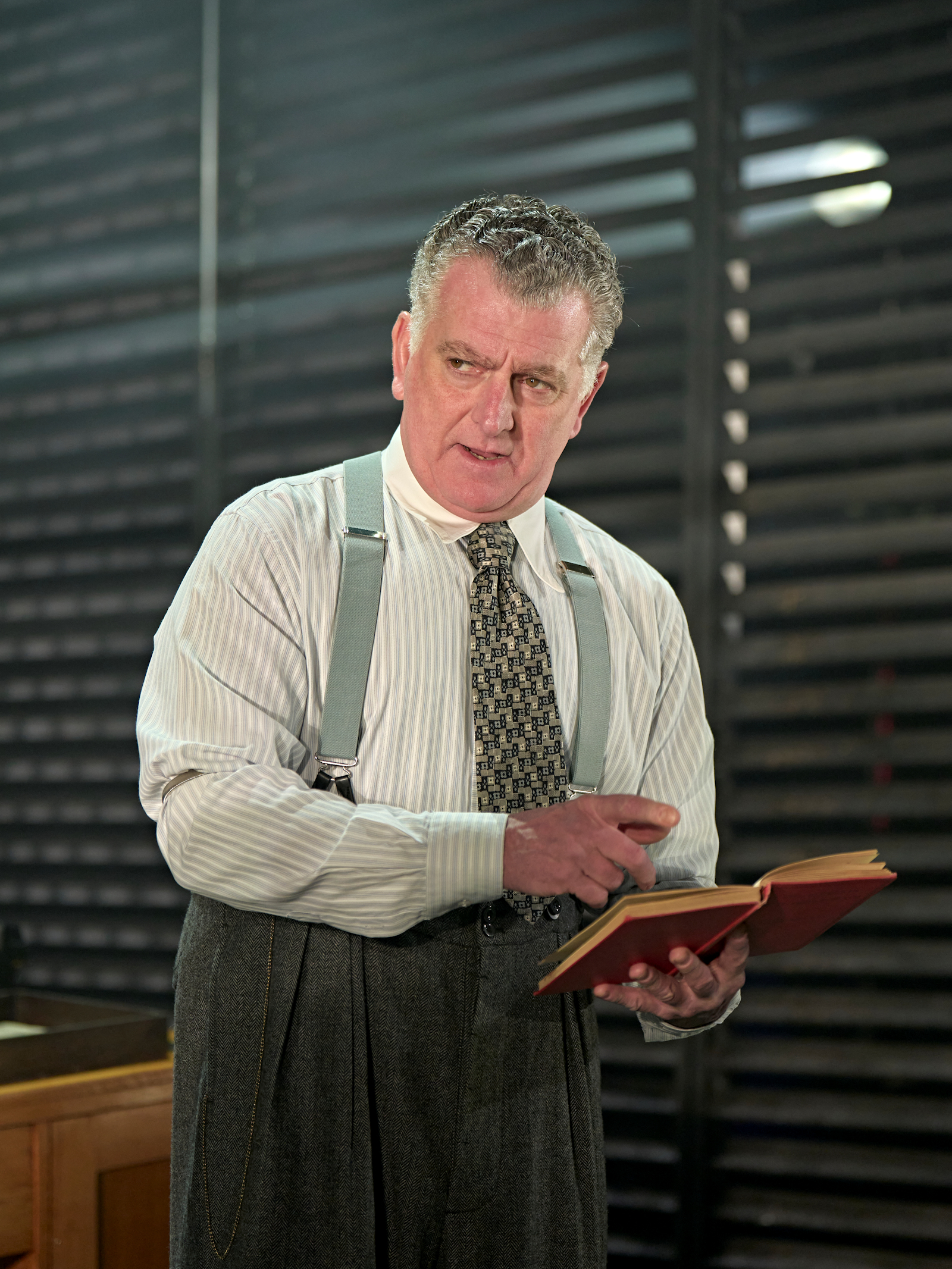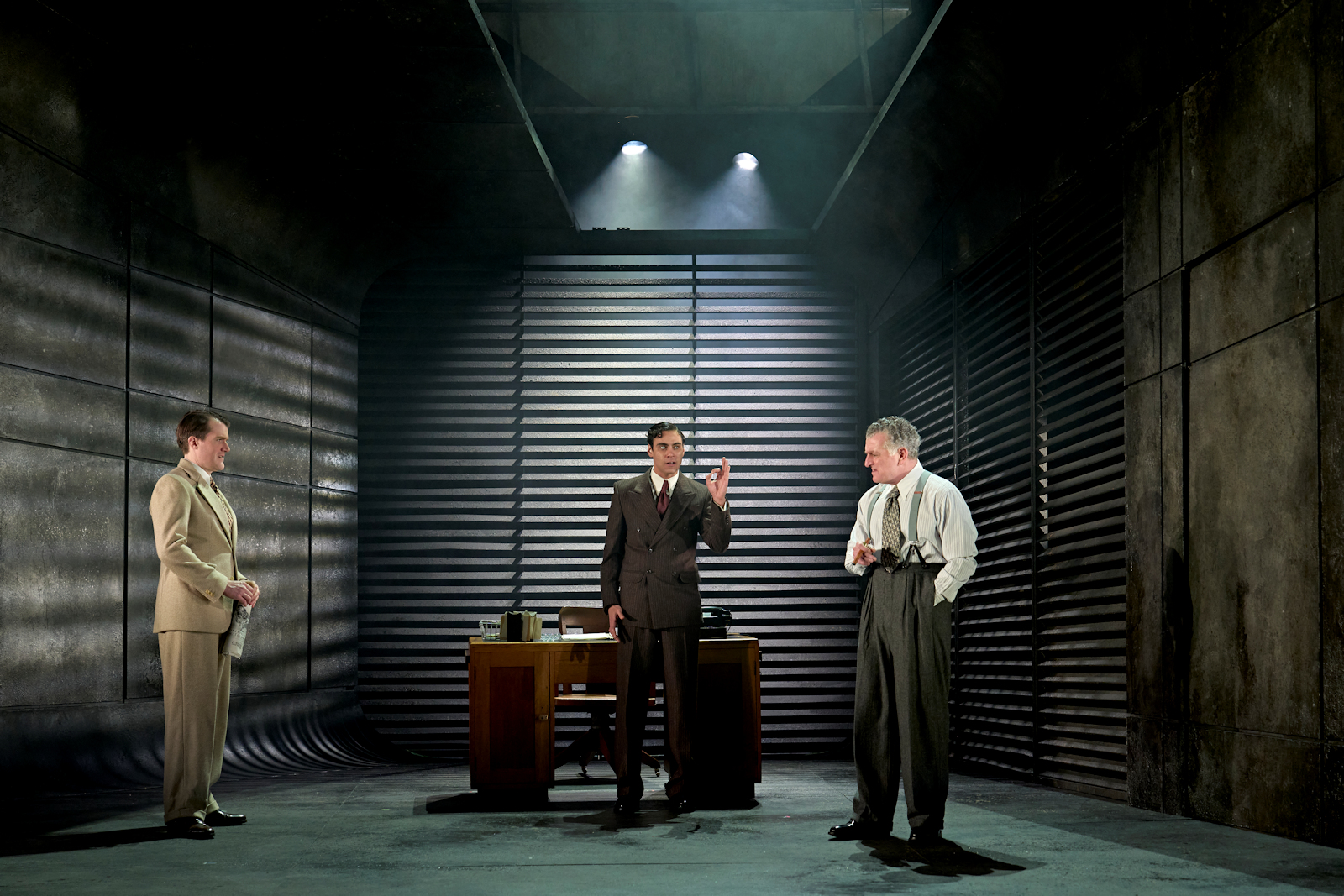 Set and costume designer Ti Green has done a remarkable job of capturing the dark, brooding and kind of cool vibe associated with Film Noir with a minimal set, keeping costumes of the era too. We fluctuate between the wealth of the Nirdlinger mansion to the dark corners of the city, where secrets are born and fates are decided. Scenes also play out with intrigue on the railway tracks, the insurance offices, Walters flat, and the tough Hollywood streets, each clearly designed to provide location and meaning. The set plays with dimensions, creating a narrowing tunnel towards the back of the stage where we can just see flashes of the Hollywood sign. Josh Gadsby has worked expertly alongside this theme as lighting designer, creating menacing shadows, and drenching the stage both subtly and obviously with blood red lighting. Less is definitely more in this production, creating space for secrets to dwell and clues to be dug out in plain sight. The audience are trusted to use our own imaginations to fill in the gaps and this pays off way more than if the set would have been lavish and over indulgent, for we can draw our own conclusions based on how much we are seduced, manipulated and persistent.