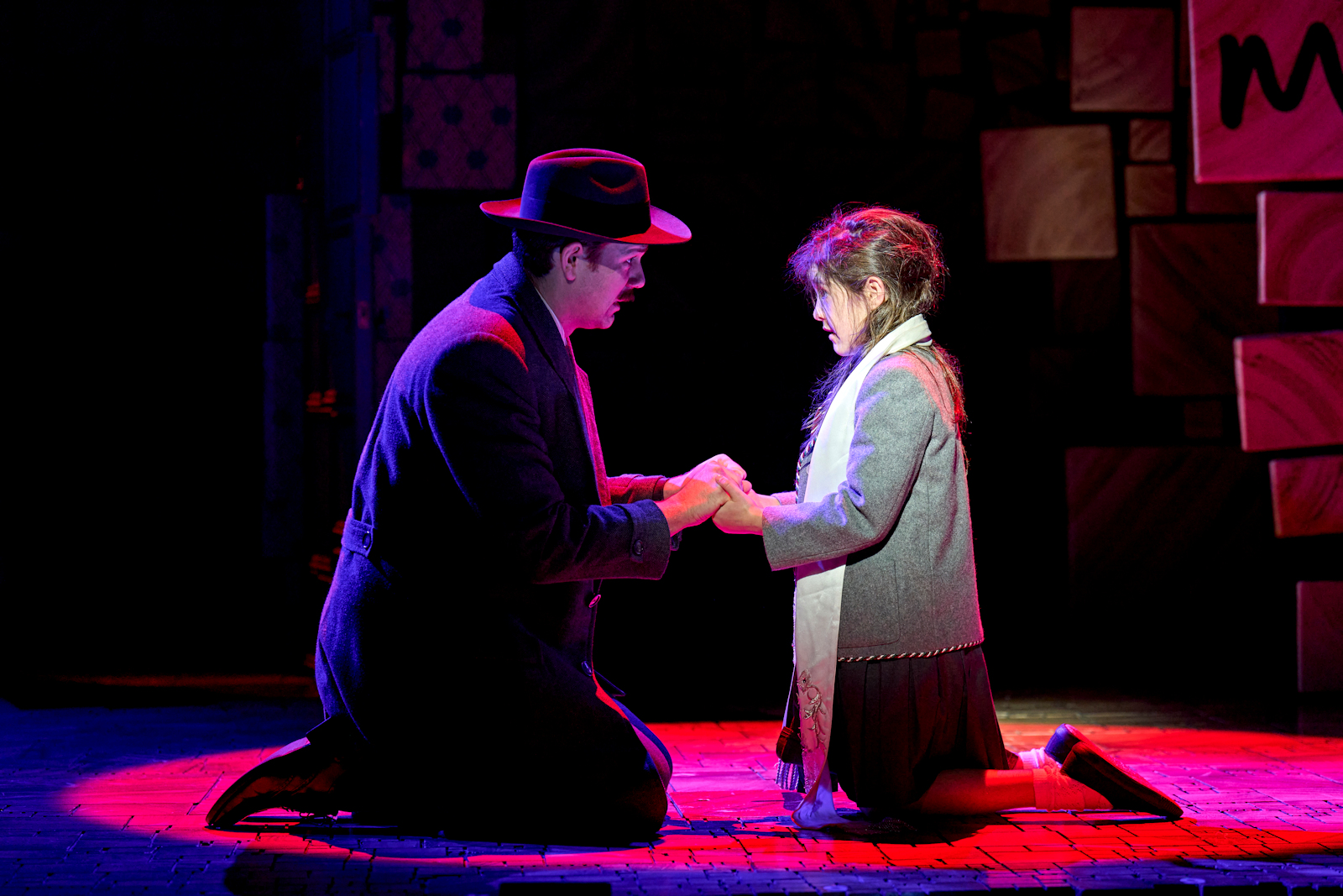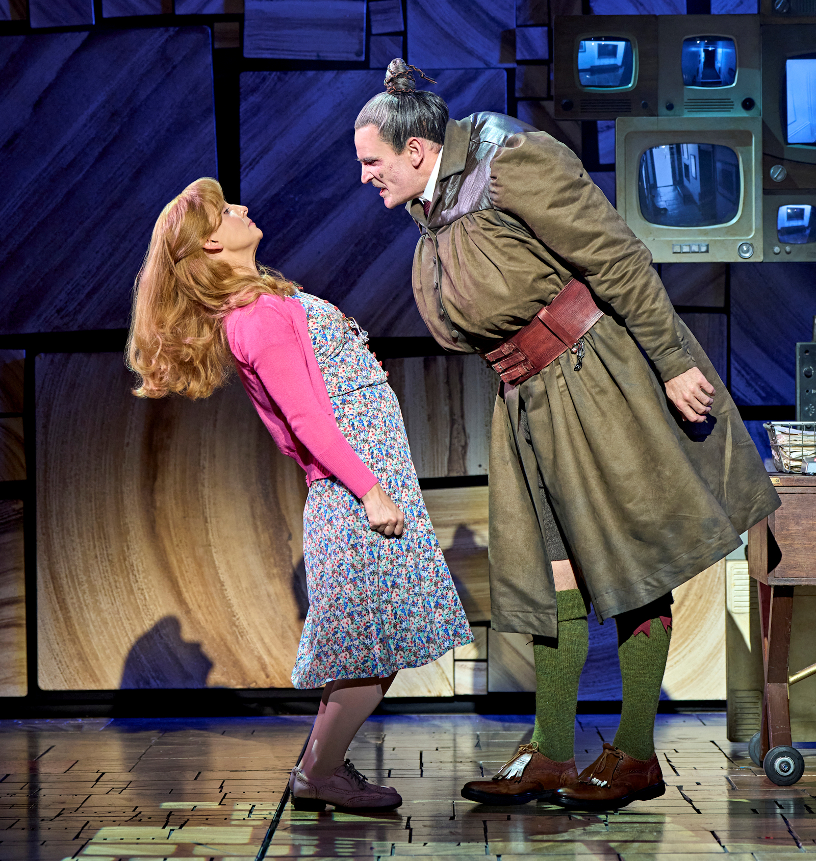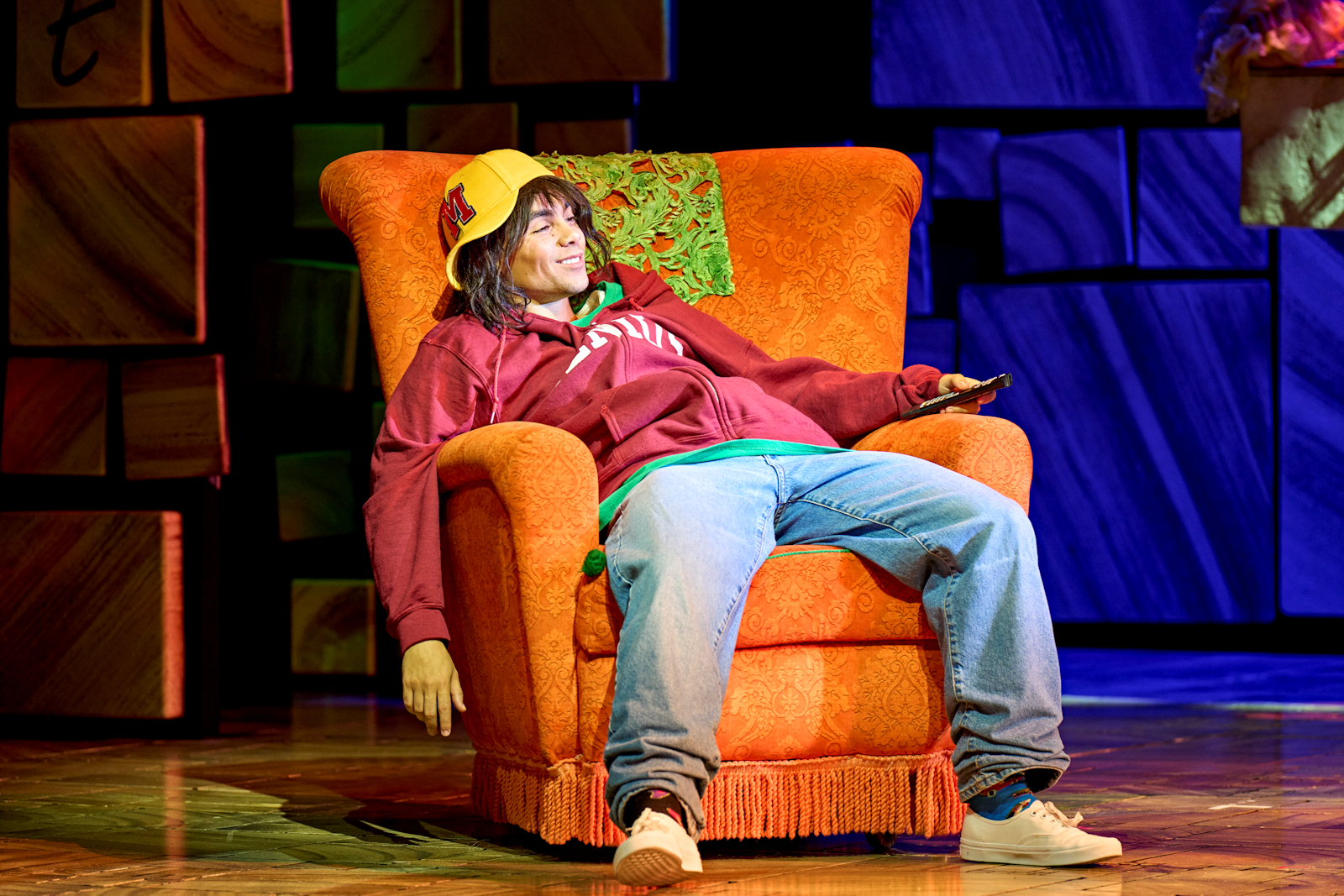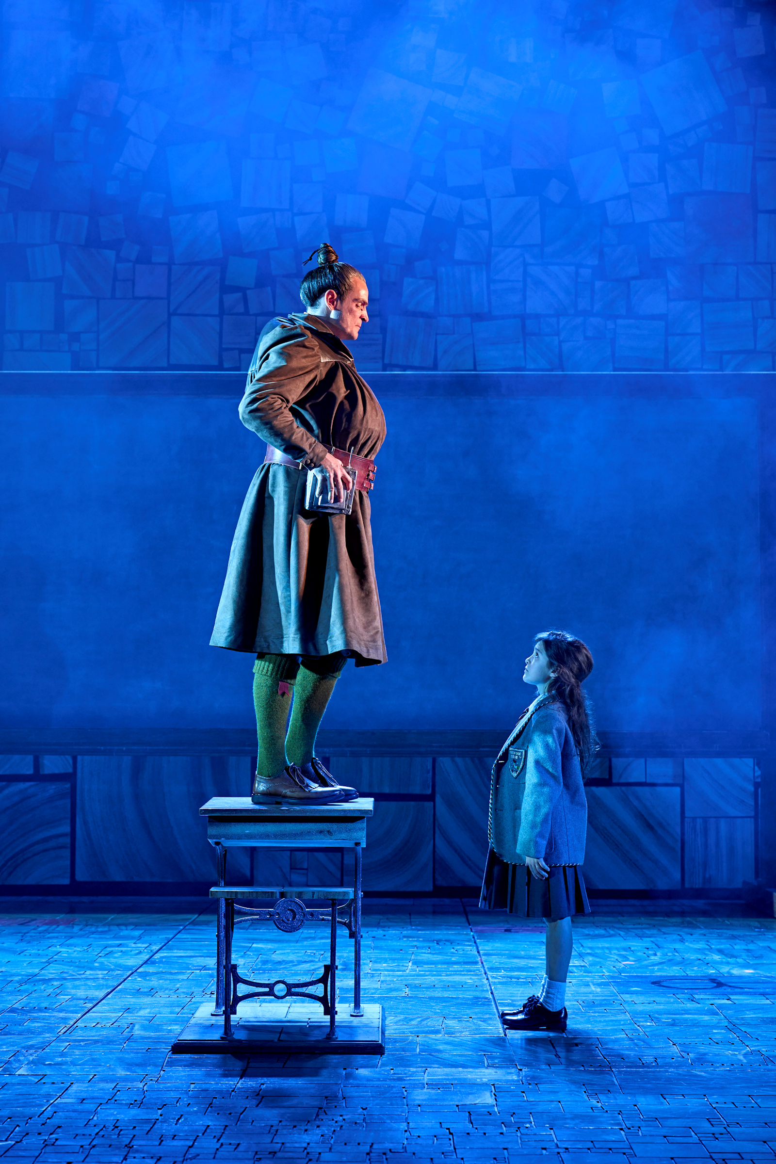 Rob Howell has designed an incredible playground within a working set, that allows walls and blocks to be climbed up, offer up spaces of escape or isolation, and allow us to believe in the expansion of the actual space. You will not be disappointed as it hints towards what Chokey has in store, you will be dying to explore the tumbling world of alphabet squares, have a go on the incredible swings that drop down from the sky, join in the rebellious jumping on and off school desks, fling yourself onto the Wormwoods sofa’s, and climb the school gates with letter blocks. If you watch carefully, the cast even land on the letter that spells or sounds out the word they are singing, just another example of the levels of inspired genius and creativity that is executed to perfection.