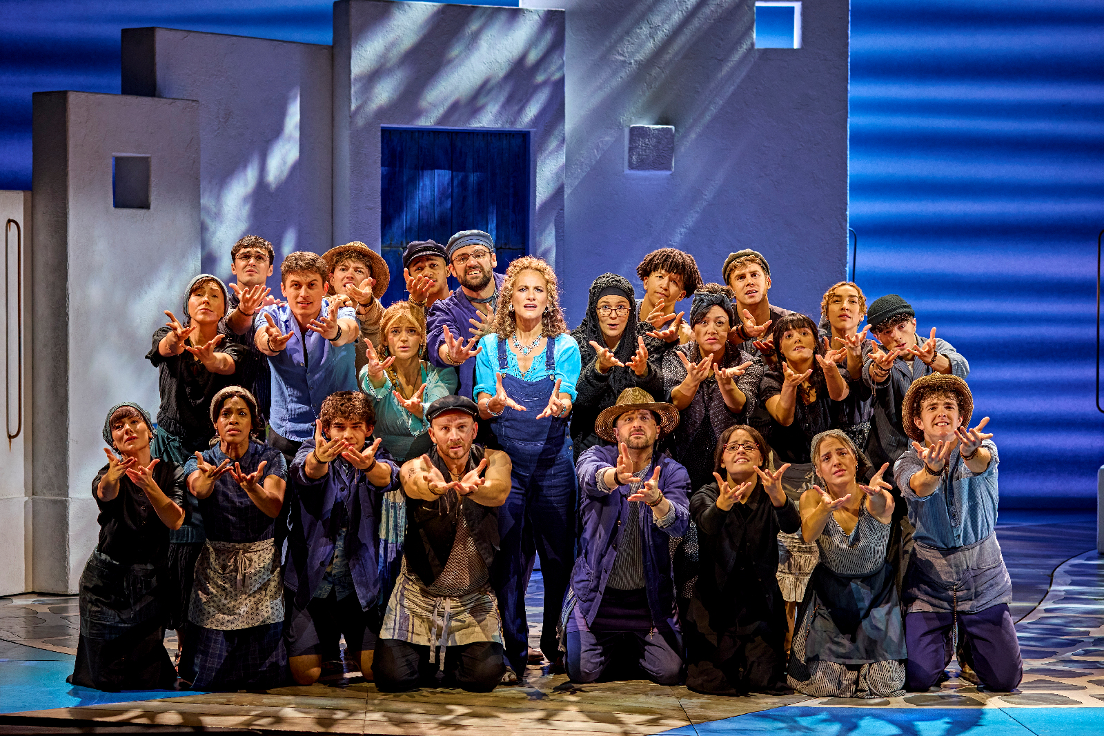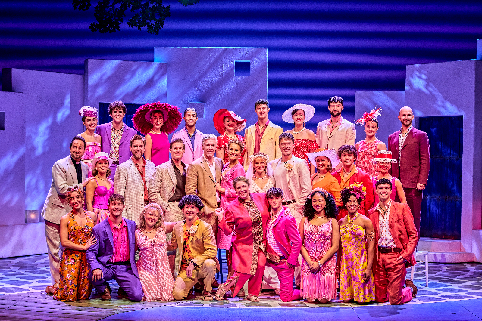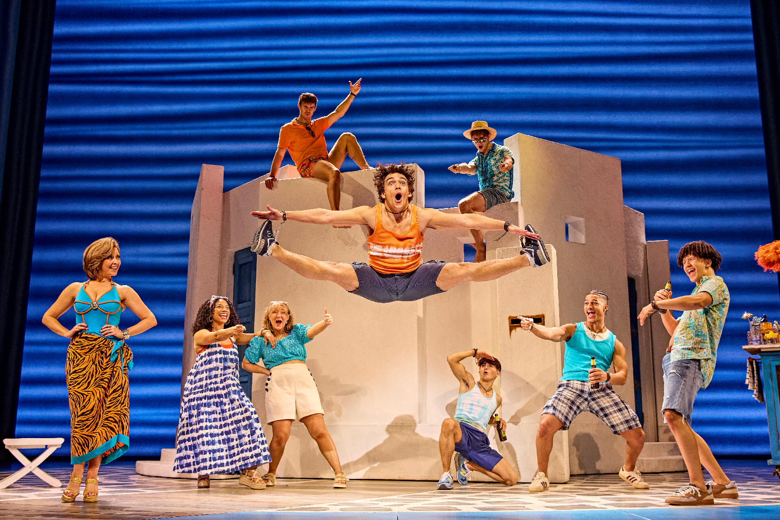 Opening with a soaring overture of all our favourite melodies, the theatre is immediately fired up for a fizzing night and the energy is palpable. We are lulled into the serene waters of this Greek island courtesy of rippling blue lights teasing us with their presence, and we are off! Sophie sits alone, beautifully singing ‘I Believe In Angels’ as she sets her plan in motion against the backdrop of the symbolic white buildings found in Greece. Designed by Mark Thompson, it is created with perfect versatility, easily splitting and morphing into a variety of positions befitting of each new scene, meaning we are taken from the hotel, to church, or a beach bar with practised ease. The colour palette is dripping with Greek tradition in this beautifully simplistic, yet detailed crumbling paradise, such as rust around the letter box or fairy lights draped intimately into a scene to enhance this idyllic vibe of holiday relaxation. With beautiful lighting designed by Howard Harrison adding to the ambience, we are transported to paradise with glorious sunshine, a moonlit beach, fluttering shadows, and even a pulsating party, island style!
