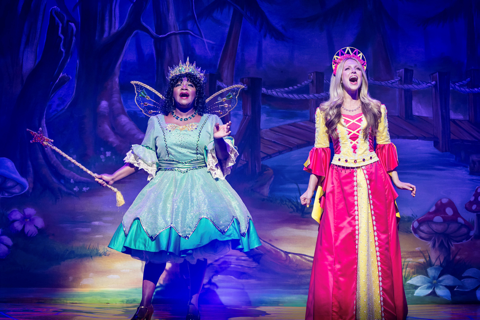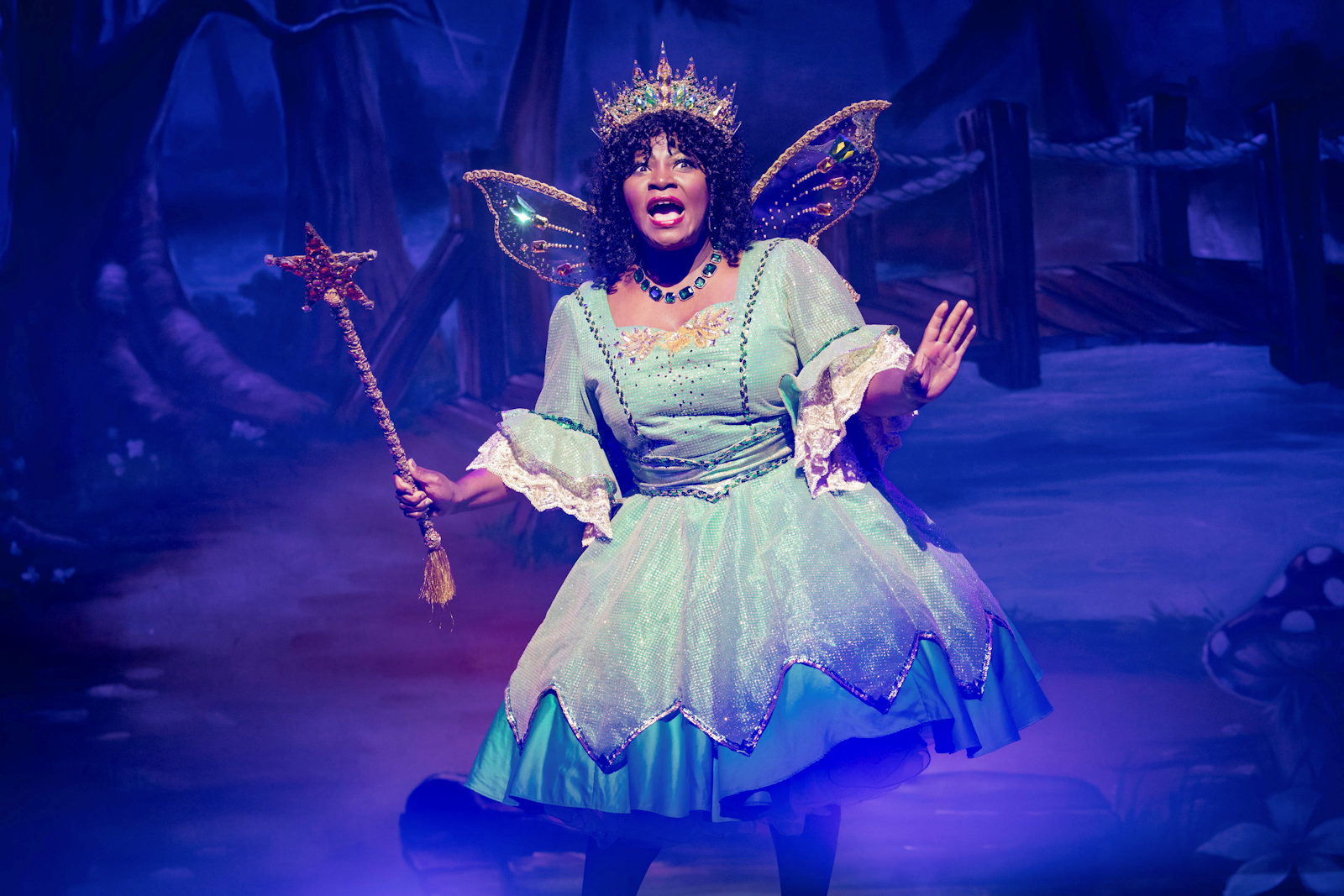 Our evil villain, the Sheriff Of Nottingham had me conflicted on whether to boo or cheer, for he was none other than the incredible Adam Strong (Rocky Horror Show, Disney’s Aladdin, We Will Rock You). Adam Strong absolutely rocks a villain, and having seen him previously as Khashoggi, Jafar, and Frank N’ Furter, I was thrilled to hear those insanely talented vocals once more. He plays evil with flair, an opulent extravagance dripping from everything he does, making us love and loathe him in conflicted measures. He knows his own voice so well and so we are continually treated to vocal gymnastics whether he is singing, speaking, or slaying with evil! Landi Oshinowo (Sister Act, Matilda, The Color Purple) is our gorgeous Spirit Of Sherwood and gives us many a spirited moment throughout with her sophisticated vocals taking us anywhere from the magical opening number to the dark and devilish Thriller. Her comedy and ability to be the fall person in the joke is expertly applauded, particularly in The Twelve Days Of Christmas where she is the continually teased by Ben Nickless. Completing the main cast is the fabulous Sarah Vaughan (Walk The Line, Cinderella, Follies) as Maid Marion. It is thrilling to see her play the role with a feistiness that defies her needing to be rescued by anyone and somehow manage to be a solid anchor amidst all the craziness going on around her. You can also feel her pure love for the show as you catch glimpses of her beaming in support of her fellow cast and ensemble, a glorious thing to see. Her vocals are out of this world and her harmonies, especially with Landi Oshinowo, are as smooth and luxurious as a delicious Christmassy hot chocolate.