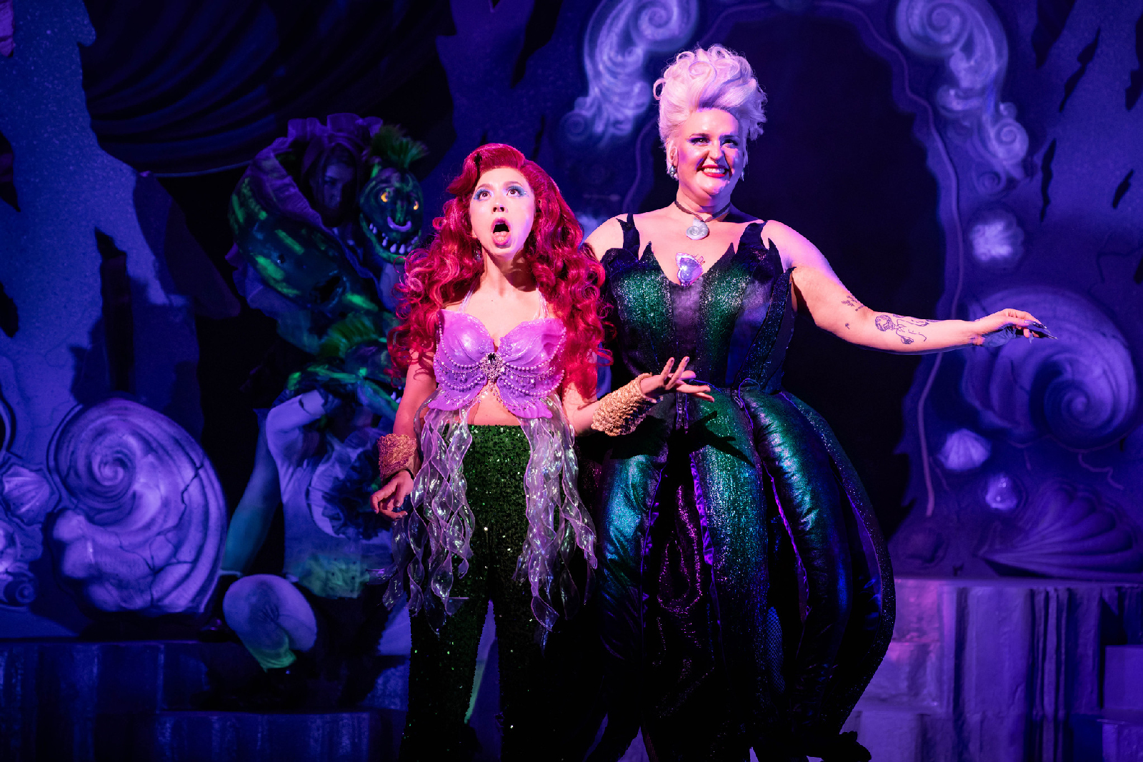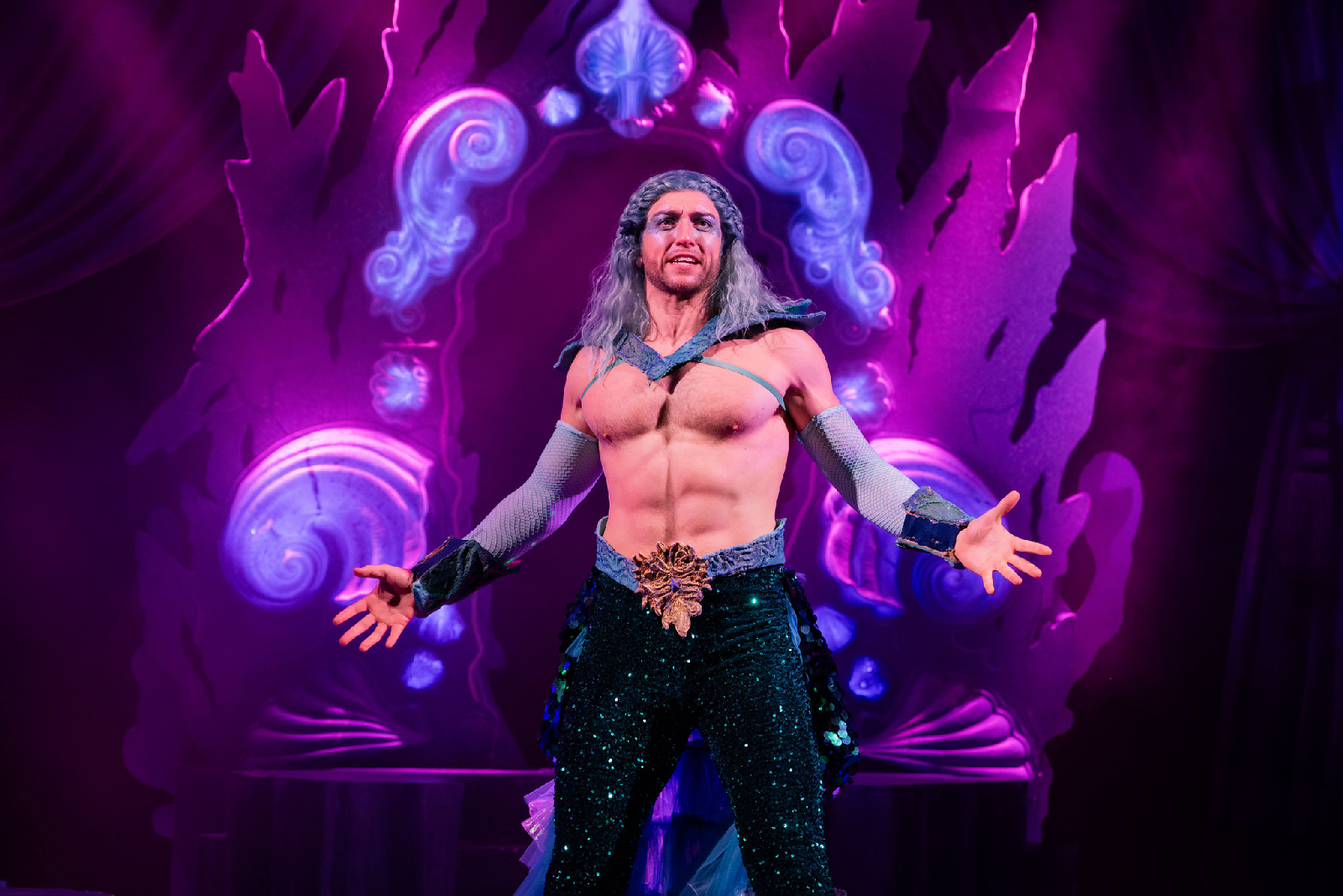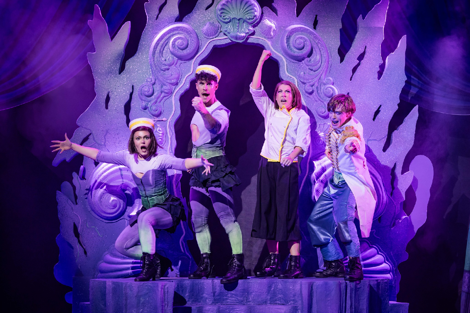 Blair Robertson rounds out the main cast as King Triton with just the right balance of loveable Himbo and genuinely soft-hearted good guy – wrapped in some rather snazzy sequins and sparkle and some excellent arms! The ensemble cast of two is made up of Freya McMahon (Hairspray) and Fionán O’Carroll (Follies, Beauty and the Beast, The Rocky Horror Show) work tirelessly to weave in and out of the unfolding scenes in a colourful array of characters in a very quick space of time. I was exhausted watching them and yet they keep the pace, bring the energy from the opening to the closing minutes and their constant rotation really does stand out as a standout performance of the evening. To be fair, most of the cast weave between several roles throughout and it’s really well done. This is a razor sharp, fiendishly fabulous cast whose energy and momentum froths like glittery star-studded sea foam and delivers a masterclass in wit and performance on every front.