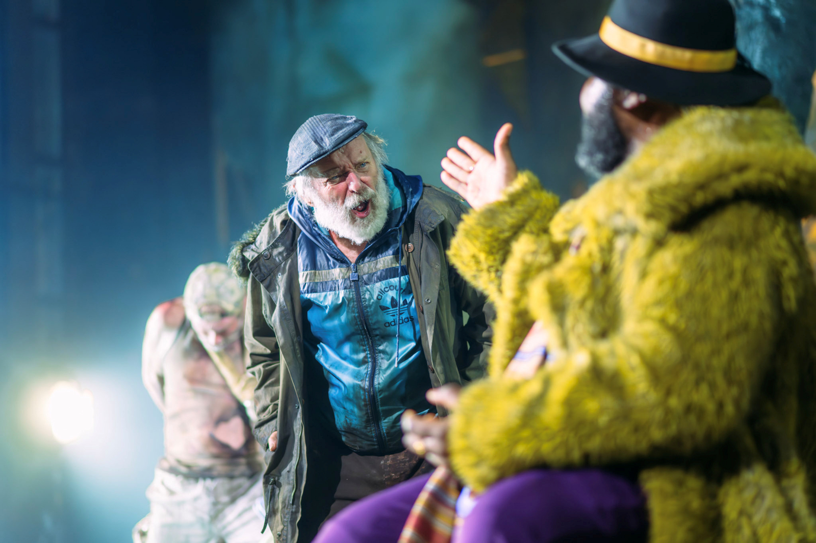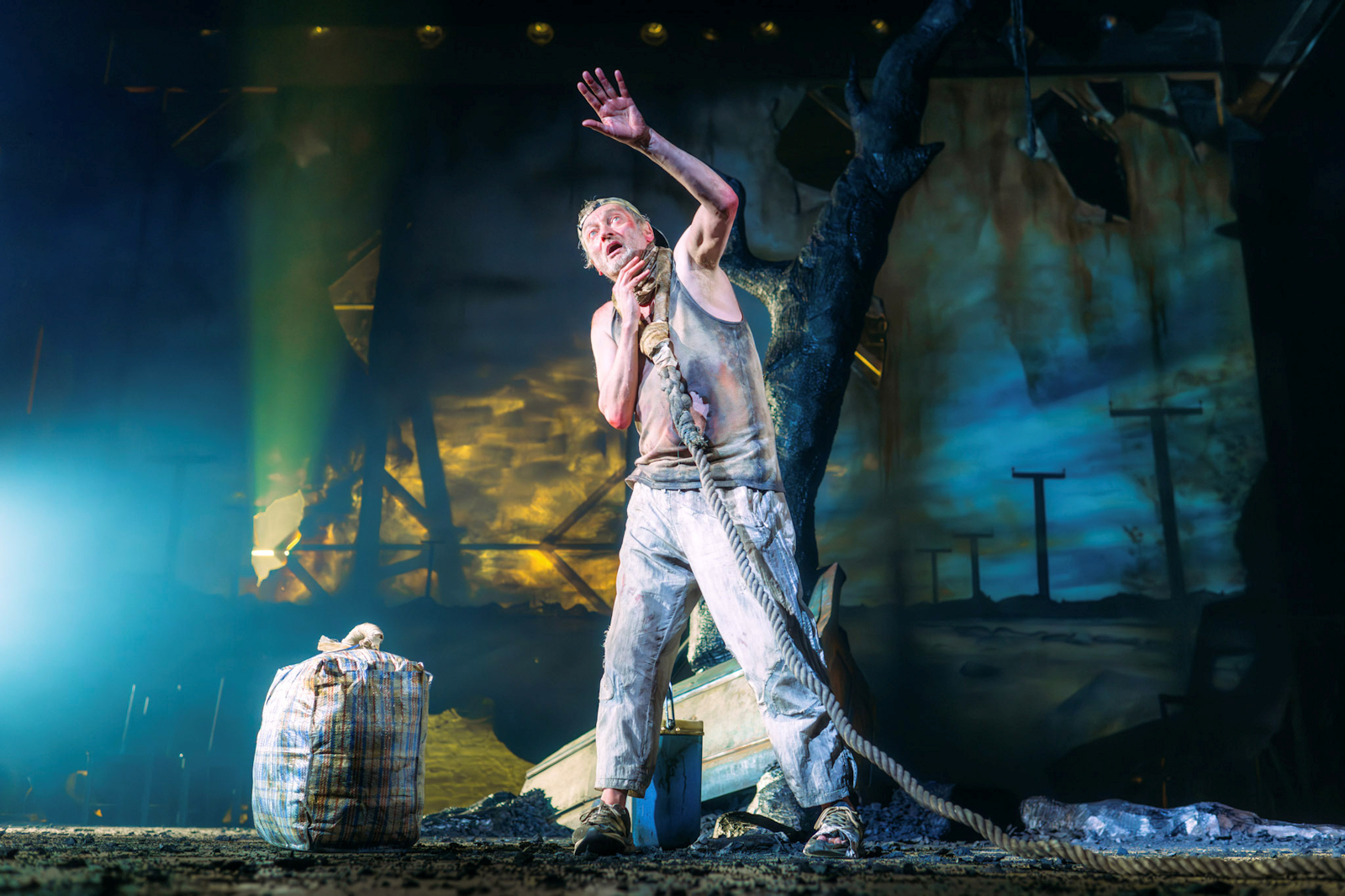 Matthew Kelly (Noises Off, Cold Blood, The Gap, Of Mice & Men) and George Costigan (The Duchess Of Malfi, Happy Valley, Long Day’s Journey Into The Night, Rita, Sue & Bob Too) are exemplary as Estragon (Gogo) and Vladimir (Didi). Their loyal and complex friendship oozes into every nook and cranny of the theatre, allowing us to fully believe these two have been friends forever and know each other inside out. We see the longitude and depth of their relationship through every deliciously thought out action, facial expression, movement, pause, and vocal choices. They irritate and irate each other, shelter and support, and comfort and care before constantly threatening to leave each other, knowing deep down that they never will. They know one another inside out, have the kind of friendship where they not only finish sentences but also thoughts, and we see these years of friendship play out across the two days in which the play is set. It is marvellous and utterly captivating. The play may have existentialism at its heart, but for me it shows that nothing is always something if you have a loyal companion by your side. Matthew Kelly brings us a frailty and pessimistic outlook as Gogo, always resigned to nothingness with his repetition of “Nothing to be done.” We feel his ache of loneliness and fear by the way he shuffles round and can break into tears mid sentence. He distracts himself from nothing by hyper fixation on physical needs such as pain and hunger and carries a child like quality that makes you want to look after him. Despite the forlorn nature of his character, it is infused with humour, particularly Northern speech patterns and nuances that draw us in and allow us to laugh at the absurdity.