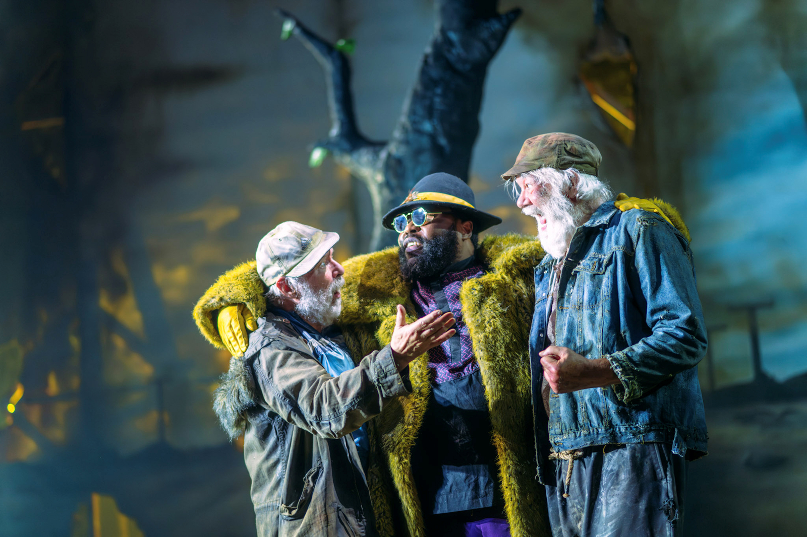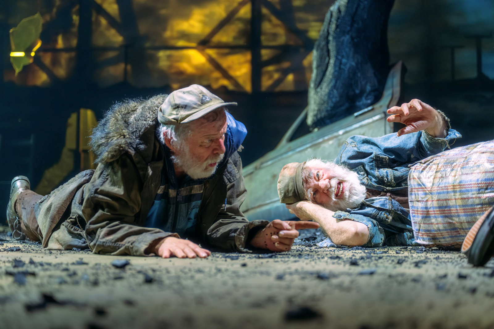 Directed by Dominic Hill, an infectious energy and humour has been brought to a play about nothingness and questioning the very meaning of life. On the surface, you would perhaps be forgiven for thinking this play would drag and feel full of despair, draining your energy, as has indeed been my previous experience of it, but in actual fact, the direction and performance is full of life, full of the kind of human spirit that is hard wired for survival and to keep going in the hope, the desire that there is something more. The relationships and characters may be outside of our own life experience, yet we recognise ourselves in them, their ability to pass the time, to create something out of nothing, to hope, to wish, to believe and have faith in something, anything, to try and make sense of why we are all here. We have all had moments of power, moments of submission, all felt alone, lost, and for the first time, this production allowed me to come away with an answer. What is it all about? What is the meaning of existence? For me, it is connection. Deep, solid, messy, fiery, incoherent, sweet connection. If we have one person to share it with, one person who knows us inside out, upside out, and truly sees us, understands us with authenticity, we have life. This production made me engage with this play for the first time and I confess I was not looking forward to it based on my previous experiences (mainly it being badly taught at university) but my mind was eagerly persuaded and completely changed. With set and costume design by Jean Chan, the ambience and starkness was perfectly captured. A large tree growing through the remains of a car the only set, apart from the odd place to sit and rest. The floor sprinkled with peat or bark, evoking desolation and dirt, a backdrop of nothingness, ripped and torn. It all said something, without saying anything, a beautiful metaphor of the play itself.