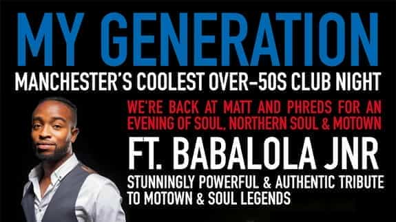 My Generation, Manchester's Coolest Over-50's Club Night, is back at Matt & Phred's for an evening of Soul, Northern Soul, and Motown - fronted by the fantastic Babalola Jnr! 'My Generation' is all about creating a club night experience for...